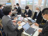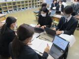 学習端末使い始めの1年生では、算数の引き算の仕方を端末上で確認し、実際のブロックを使って理解を深める授業を行いました。