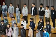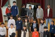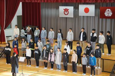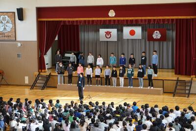 11月12日(水)市内音楽会に出場する6年生2クラスと11月18日(火)地区音楽会に出場する5年1組の音楽朝会を行いました。