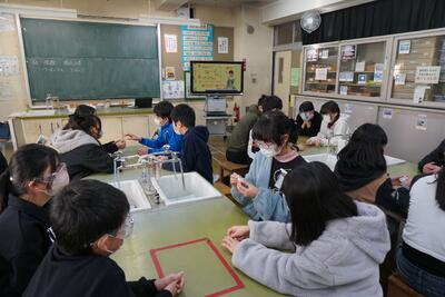 「アルミニウムに塩酸を入れるとどうなるか?」という問いに、子供たちは興味津々。