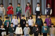 初めての音楽朝会、全校児童の前で発表するので、いつもより緊張している面持ちの1年生でした。