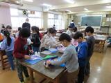 のりを紙に付け、かざりを貼り付けていました。