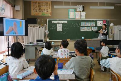 1年1組で教育実習生が手洗いに関する授業を行いました。