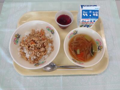 10/10の給食 投稿: 管理者 (10/10) <今日のこんだて> そぼろ丼 牛乳 米粉ワンタンスープ 手作りブルーベリーゼリー 今日は、目の愛護デーにちなみ、目に良いとされる「アントシアニン」が豊富なブルーベリーを使ったゼリーを、給食室で手作りしました。 水、粉寒天、砂糖をしっかり溶かして、ブルーベリーソースを加えます。 ゼリーカップにナタデココを入れ、できたゼリー液を流しいれます。 冷蔵庫で冷やして完成です☆ Tweet -